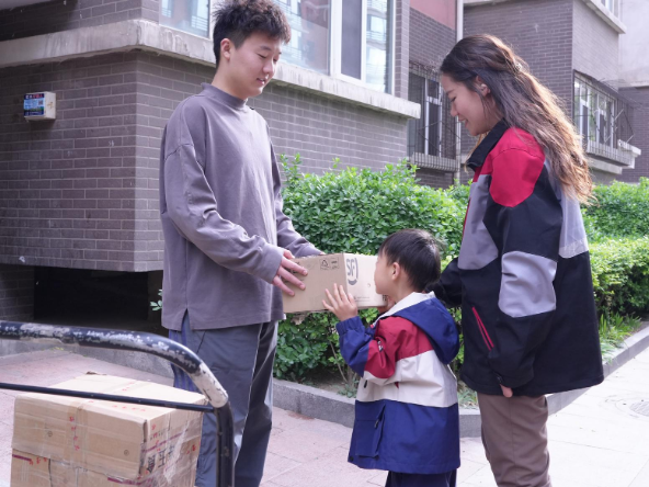 母子倆戴上頭盔,奔赴第一個(gè)派送點(diǎn)。到達(dá)小區(qū)后,面對要送2件、取1件的任務(wù),辰辰興奮地自告奮勇抱起快遞跑進(jìn)樓道,卻很快被現(xiàn)實(shí)“上了一課”——沒有電梯,收件人住在5層。當(dāng)他送完這家,額頭滿是汗水,步伐也明顯跟不上媽媽了。出了小區(qū),辰辰一句“真累呀,還有那么多,得送到啥時(shí)候啊”,道出了孩子對媽媽工作艱辛的初步體會。而閆詩琪輕撫兒子頭說道,“孩子,干啥工作也要有耐心。”不僅是對兒子的鼓勵,更是她日常工作的真實(shí)寫照。