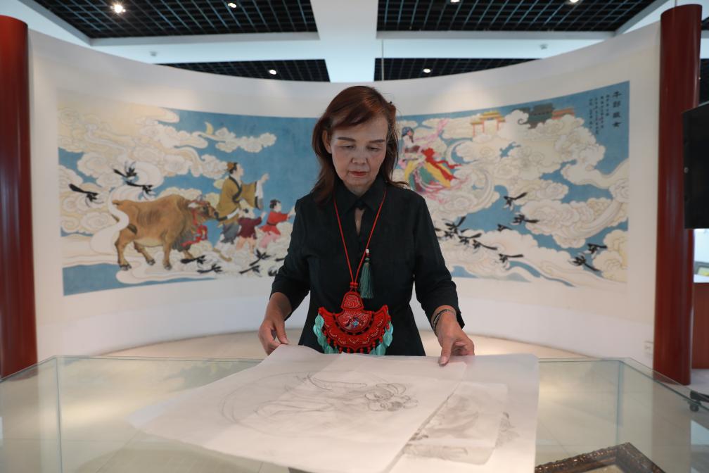 范素萍正在整理和順刺繡作品的手稿。新華社記者 張哲 攝