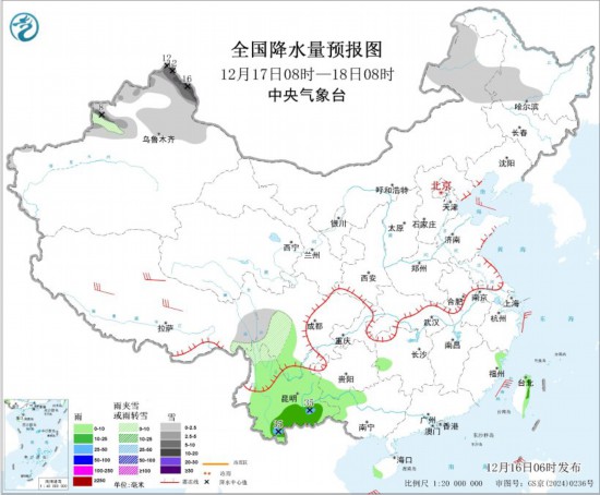 12月17日08時(shí)至18日08時(shí),內(nèi)蒙古東北部、黑龍江西南部、新疆北部、川西高原南部等地部分地區(qū)有小到中雪或雨夾雪,其中,新疆阿勒泰地區(qū)和伊犁河谷局地有大到暴雪(10~16毫米)。西南地區(qū)南部、湖南西部、福建東北部、廣西西北部、海南島西南部等地部分地區(qū)有小到中雨,其中,云南東南部局地有大雨(25~35毫米)。西藏中北部等地部分地區(qū)有4~6級(jí)風(fēng);東海南部海域、臺(tái)灣海峽、巴士海峽、南海東北部和中東部海域?qū)⒂?~7級(jí)大風(fēng)、陣風(fēng)8級(jí)。
