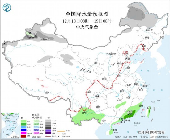 12月18日08時(shí)至19日08時(shí),內(nèi)蒙古東北部、黑龍江中北部、新疆北部和南疆西部山區(qū)、甘肅河西等地部分地區(qū)有小到中雪或雨夾雪,其中,新疆沿天山地區(qū)和伊犁河谷局地有大到暴雪(10~16毫米)。湖南南部、福建東部和南部、西南地區(qū)南部、廣西西南部、廣東東部和南部、海南島東部、臺(tái)灣島東部等地部分地區(qū)有小到中雨,其中,廣東東部局地有大雨(25~35毫米)。遼寧東部、西藏中北部等地部分地區(qū)有4~6級(jí)風(fēng);臺(tái)灣海峽、巴士海峽、南海東北部和中東部海域?qū)⒂?~7級(jí)大風(fēng)、陣風(fēng)8級(jí)。