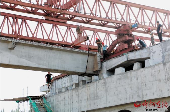 7月29日,原平市前進街東拓工程滹沱河大橋施工工地,大橋主跨預(yù)制混凝土橫梁從牽引車上徐徐吊起,穩(wěn)穩(wěn)地安放在主橋墩上。該預(yù)制混凝土橫梁長30米、高1.6米、寬2.4米,總重量93噸。這一突破性推進將大大加快工程進度。 褚 震 攝