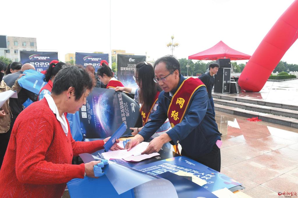 在2020年國家網(wǎng)絡安全宣傳周活動中,定襄縣采取多部門聯(lián)合的方式,通過懸掛宣傳橫幅、擺放宣傳展板、發(fā)放網(wǎng)絡安全知識手冊等形式,深入宣傳數(shù)據(jù)安全管理、個人信息保護等方面的法規(guī)、標準,并重點圍繞個人信息保護、網(wǎng)上交易辦理、惡意軟件清理、金融詐騙防范等市民關心關注的內容開展宣講、提供咨詢服務,切實提高廣大人民群眾網(wǎng)絡安全意識和防護技能,引導廣大群眾依法用網(wǎng)、文明用網(wǎng),營造健康文明的網(wǎng)絡環(huán)境。圖為9月15日縣城宣傳現(xiàn)場。 張玉虎 攝