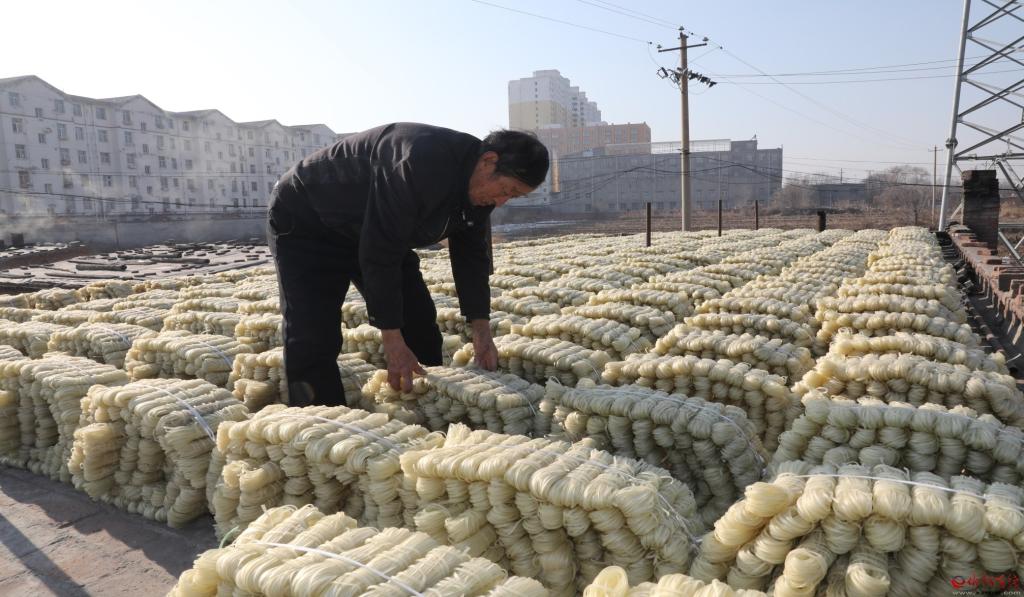 12月23日,原平市新原鄉(xiāng)班村老賈粉條加工廠內(nèi),老賈正在打捆制作好的粉條。老賈加工粉條已有30多個(gè)年頭,生產(chǎn)的傳統(tǒng)手藝無(wú)添加劑綠色粉條,很受市民青睞,不僅占領(lǐng)了本地市場(chǎng),還遠(yuǎn)銷大同、包頭,產(chǎn)品供不應(yīng)求。 (褚 震 攝)