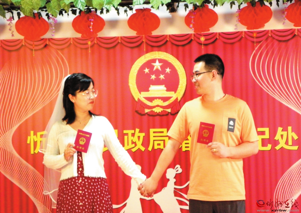 在頒證儀式上,登記員帶領新人宣讀結婚誓言。忻州市婦聯(lián)、市民政局相關領導為新人送上溫馨祝福。在忻府區(qū)民政局婚姻登記服務中心,新人們臉上洋溢著幸福的笑容,來到婚姻登記窗口依次辦理結婚手續(xù)。