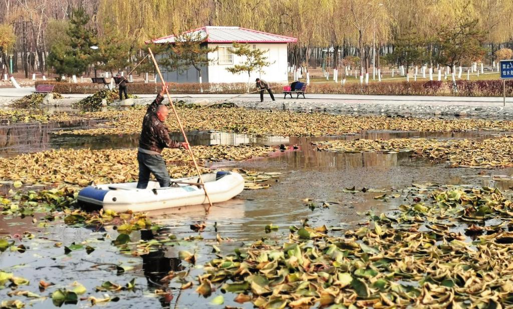 近日,五臺縣園林工人在濕地公園打撈水面上的垃圾和落葉。入冬以來,天氣漸冷,葉落花謝,五臺縣適時啟動水面清潔工作,打造凈水環(huán)境。(金俊賢 攝