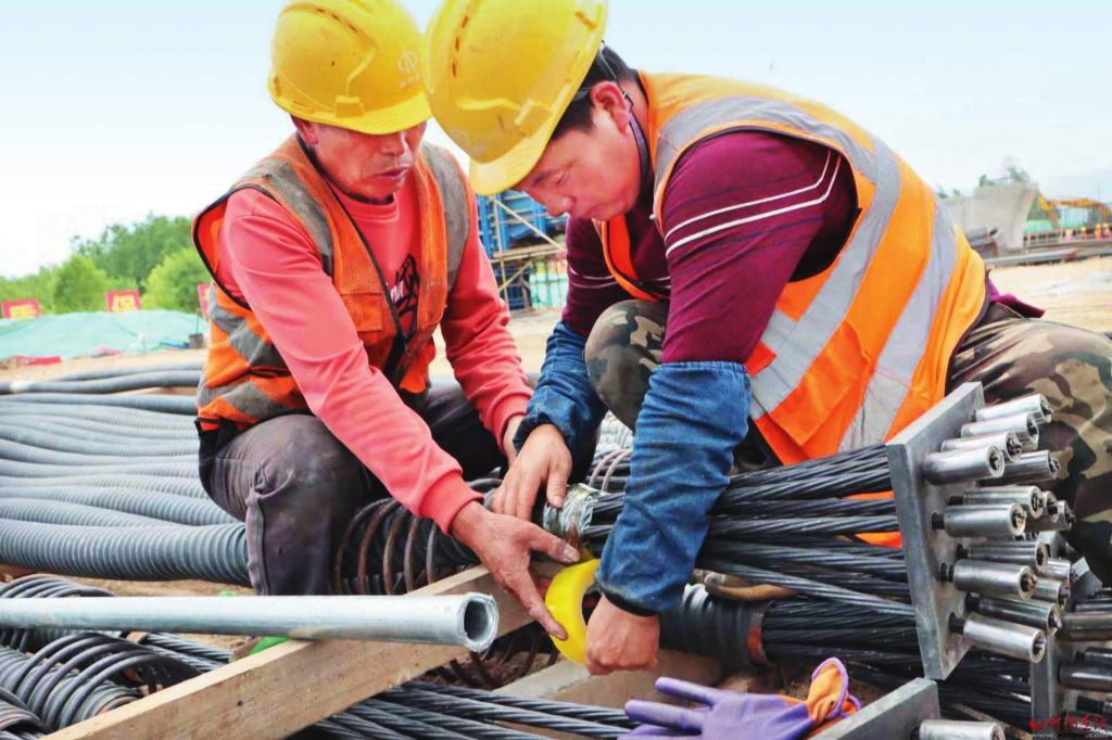 記者近日走進(jìn)南北通道菱形立交橋工地,只見密密匝匝的鋼筋林立如網(wǎng),奮戰(zhàn)在太忻大道一線的工人們頂烈日、冒酷暑、戰(zhàn)高溫,汗流浹背、干勁不減。技術(shù)員仔細(xì)檢查著每一個(gè)接口、鋼筋工熟練準(zhǔn)確排布每一組鋼筋結(jié)構(gòu),井然有序,規(guī)范自如?!澳媳蓖ǖ懒庑瘟⒔粯蚬こ淌琼?xiàng)目中兩處混凝土澆筑工程之一,目前工程前期準(zhǔn)備工作已接近尾聲,全部澆筑工程任務(wù)將在9月10日前完成。”項(xiàng)目一隊(duì)負(fù)責(zé)人尹耀軍自信滿滿。