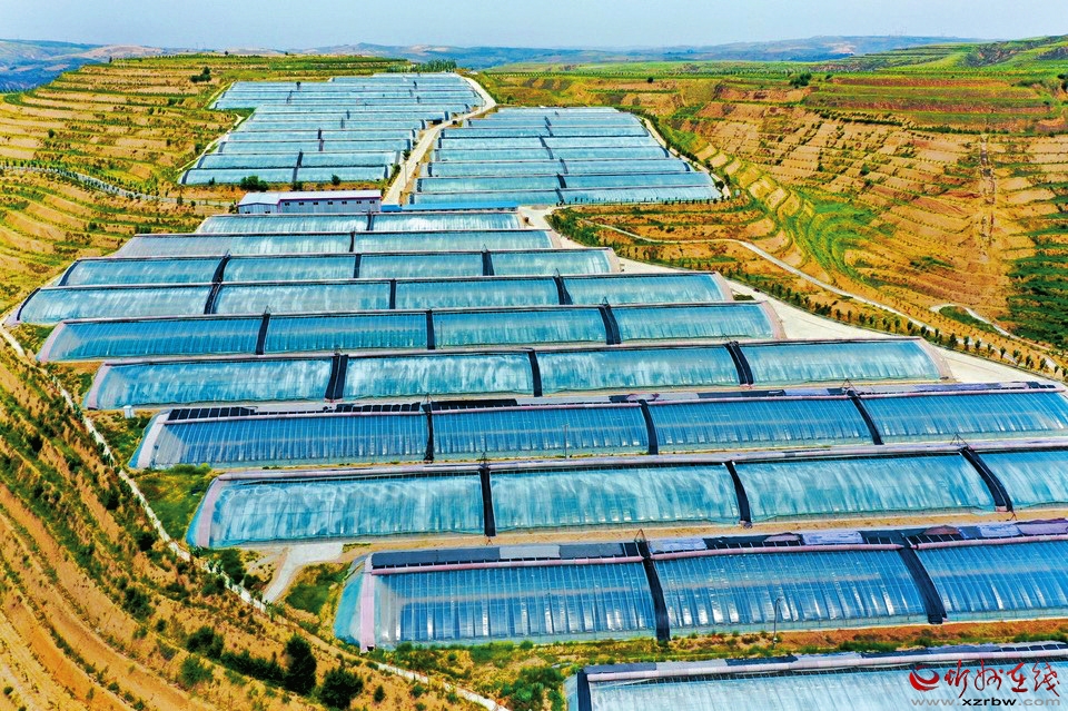 峁梁之間,溝壑縱橫。下了高速,路隨峁轉,快到榆嶺窊,車窗外的風景也變了,密集閃過一排排人造林。上峁放眼,溝梁之間,成片的日光溫室大棚宛如湖泊,在冬日暖陽下反射出粼粼波光。大棚之上,這邊一排排白墻灰瓦是別墅群,那邊人才公寓緊挨著老年公寓,飄揚著鮮艷國旗的地方是榆嶺窊村黨群服務中心。