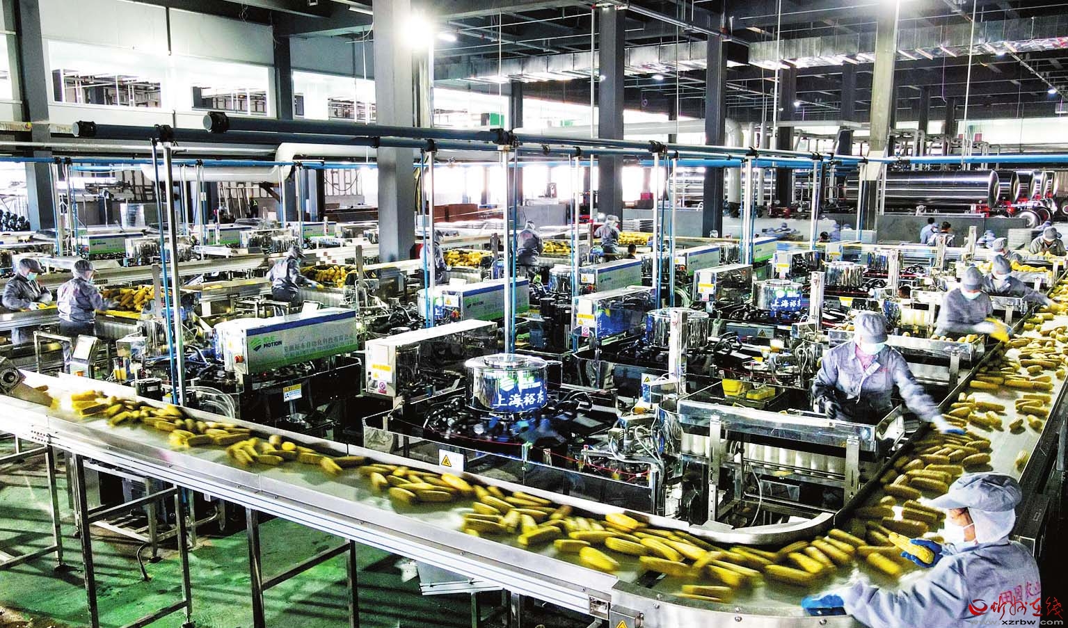 總占地面積約100畝的五寨縣甜糯玉米產(chǎn)業(yè)園,坐落于五寨縣的國(guó)家農(nóng)村產(chǎn)業(yè)融合發(fā)展示范園。園內(nèi)采用國(guó)內(nèi)先進(jìn)的生產(chǎn)工藝,從機(jī)器去皮、切梗去尖、巴氏滅菌、真空包裝到速凍隧道、智能庫(kù)房等,實(shí)現(xiàn)去皮、切頭、清洗、分級(jí)、殺菌、蒸煮、包裝的全流程機(jī)械化自動(dòng)化,極大地提高了加工效率,每小時(shí)可加工甜糯玉米27萬(wàn)穗,最大限度保留了玉米的色、香、味和營(yíng)養(yǎng)成分。