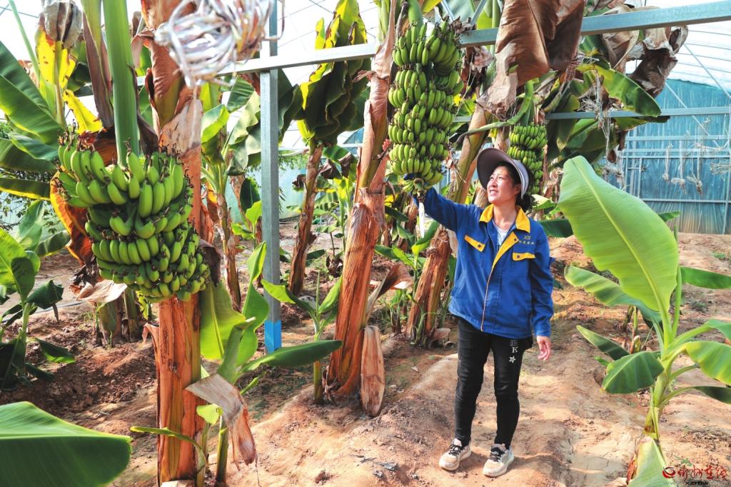 去年,侯學(xué)光在大棚開始試種“中蕉九號”?!靶酶畢^(qū)的水土環(huán)境竟與蕉苗生長條件高度契合,根系健壯少病害,首年就順利掛果。香蕉未熟時脆甜清香,成熟后軟糯可口,品質(zhì)不輸南方蕉。”他興奮地向記者介紹說。通過邀請專家改良土壤、施用自產(chǎn)有機肥、科學(xué)規(guī)劃間距,曾經(jīng)的邊角地已變身茂密蕉林。