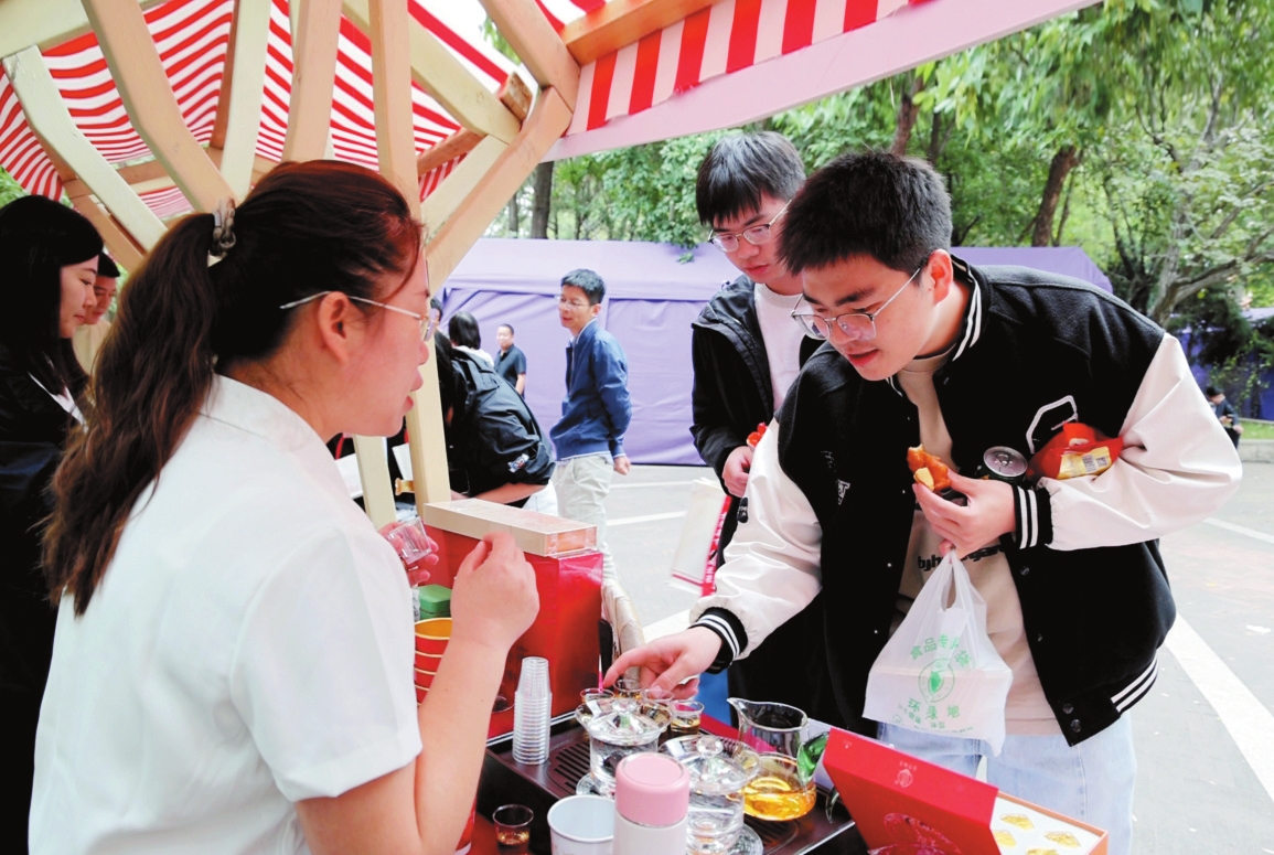 我市在清華大學(xué)國防教育林舉辦秋季學(xué)期學(xué)生地域文化節(jié)暨“人到山西好風(fēng)光”忻州專場活動。圖為清華大學(xué)學(xué)生品嘗毛建茶。本報(bào)記者范琛攝