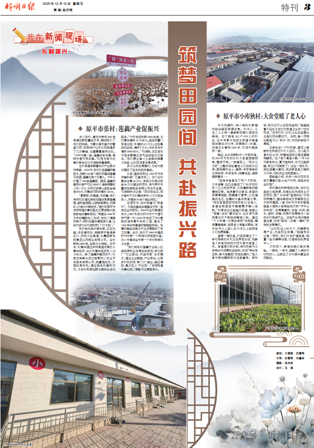 張村地處城鄉(xiāng)接合部,區(qū)位優(yōu)越,東鄰滹沱河,南接原平高速路出口,西鄰大運(yùn)高速,北靠國(guó)家電投集團(tuán)山西鋁業(yè)有限公司。全村耕地2400畝,全部為水澆地。近年來(lái),村集體通過(guò)多種渠道發(fā)展壯大集體經(jīng)濟(jì),2023年集體經(jīng)濟(jì)收入20萬(wàn)余元。除了蓮藕種植項(xiàng)目外,村黨支部牽頭成立智聚民心農(nóng)業(yè)開(kāi)發(fā)服務(wù)有限公司,購(gòu)置拖拉機(jī)、打捆機(jī)等農(nóng)機(jī),通過(guò)服務(wù)托管的方式,為本村和周邊群眾提供社會(huì)化服務(wù)?!敖衲晖瓿汕锔?000余畝,為村集體增收10萬(wàn)余元;盤(pán)活閑置門(mén)面房出租,年增收4.5萬(wàn)元;出租集體機(jī)動(dòng)地,增收5萬(wàn)元;光伏發(fā)電年增收5000余元?!惫瓭?rùn)鎖,這位老支書(shū)飽含感情且語(yǔ)氣堅(jiān)定地對(duì)記者說(shuō),“我們要讓每寸土地都發(fā)揮最大效益,讓村民共享發(fā)展成果。”