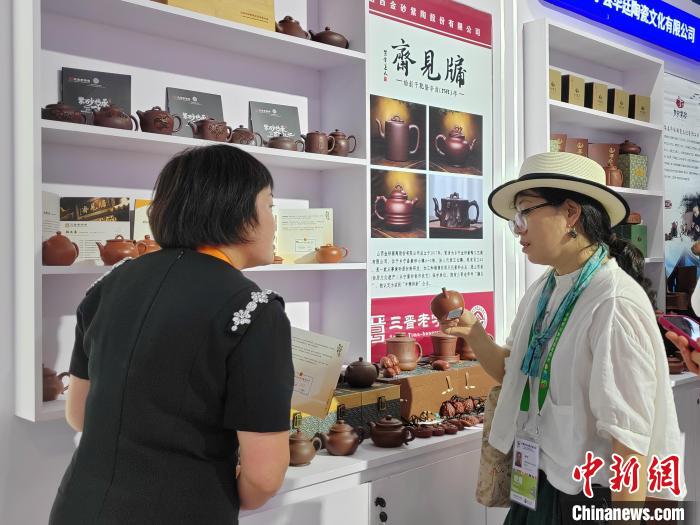 現(xiàn)場工作人員向觀眾介紹山西鄉(xiāng)寧紫砂陶器。高雨晴 攝