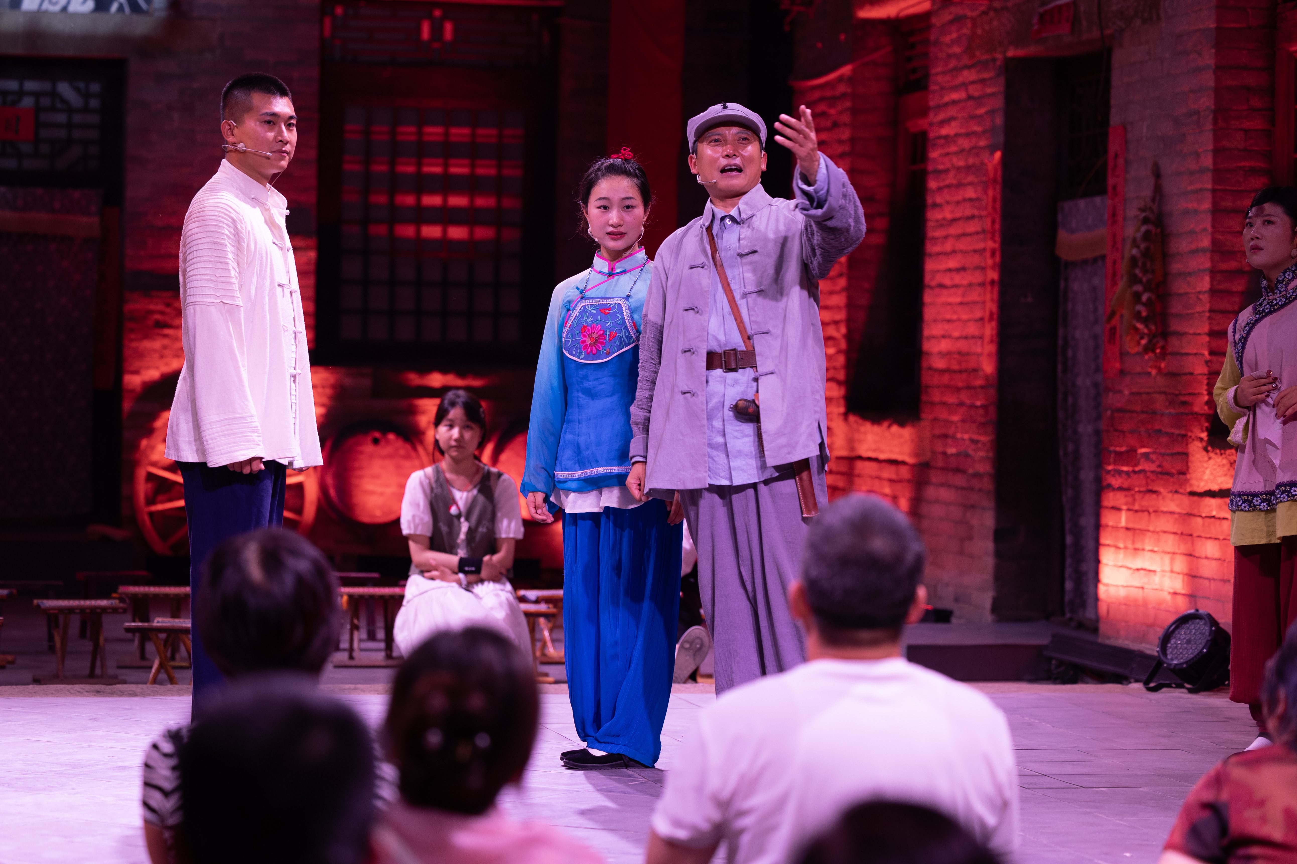 “小芹呢?小芹去哪了?”夜晚,楊家東院的紅燈籠亮起,近百名游客坐在小馬扎上。隨著俏皮輕快的音樂,一位潑辣的婦女,身穿花布衣裳,從一側(cè)偏房中走出,扭著夸張步伐上場(chǎng),來人正是“三仙姑”。