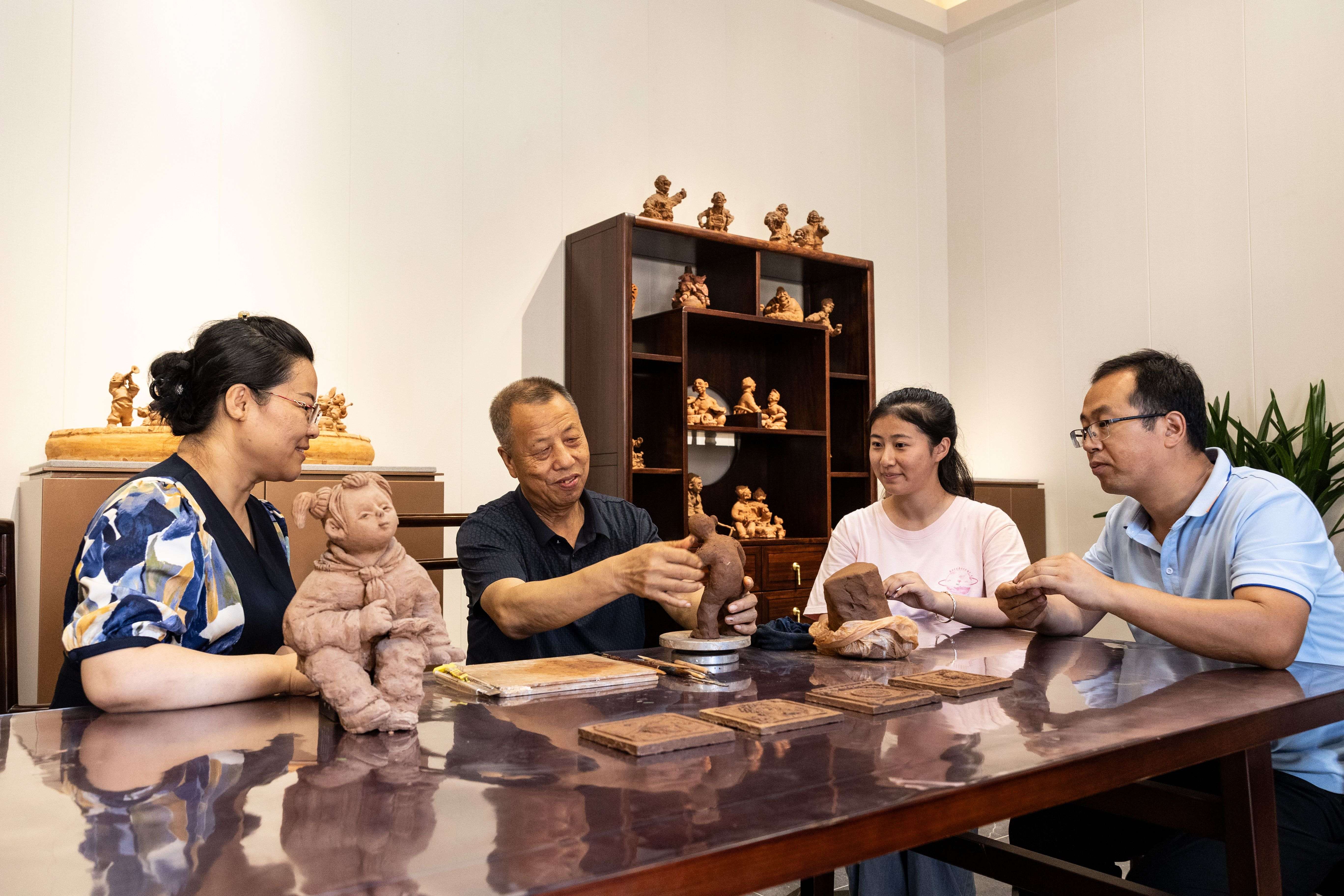 高平市釜山村,古泫泥塑非遺傳承人史月明向游客展示泥塑技藝。王劍 攝