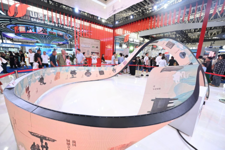 8月22日,山西文博集團(tuán)展區(qū),游客被莫比烏斯環(huán)柔性屏上展示的珍貴文物吸引。本報(bào)記者楊晨玉攝