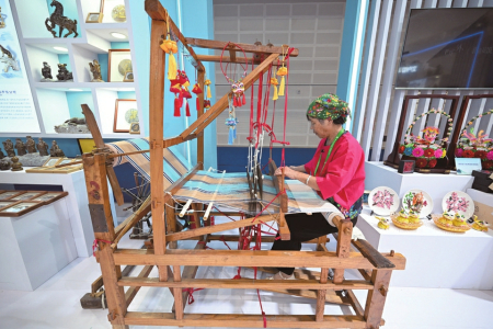 8月21日,運(yùn)城展區(qū),工作人員展示老粗布制作過(guò)程。本報(bào)記者阮洋攝