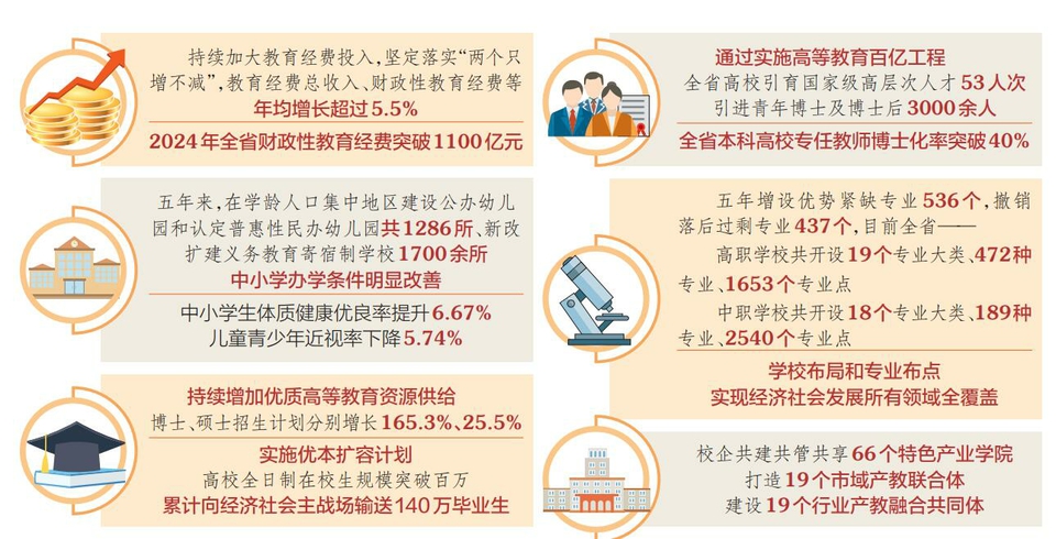 省委教育工委書記,省教育廳黨組書記、廳長馬駿介紹,“十四五”期間,我省持續(xù)加大教育經(jīng)費投入,堅定落實“兩個只增不減”,教育經(jīng)費總收入、財政性教育經(jīng)費等年均增長超過5.5%,2024年全省財政性教育經(jīng)費突破1100億元。推進基礎教育擴優(yōu)提質,組建600個城鄉(xiāng)教育共同體,有序增加高中學位供給,20萬人口以上的縣實現(xiàn)特殊教育學校全覆蓋,隨遷子女、殘疾兒童平等接受教育得到充分保障。學生資助體系實現(xiàn)學段、學校、學生全覆蓋,累計惠及1373萬人次。今年起免除公辦幼兒園學前一年保教費,群眾的教育獲得感、幸福感持續(xù)提升。