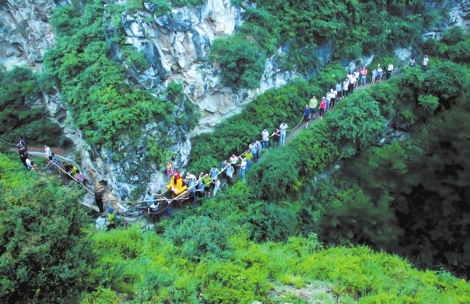 上山的路越來越難走,也越來越危險。前方是峭壁,只容一人通過,腳下便是萬丈深淵,一旦失足,后果難料。女士們有點害怕。朱部長一邊鼓勵,一邊教她們要領:踩實、抓穩(wěn)、不要向下看。前面幾位戰(zhàn)戰(zhàn)兢兢相繼通過,最后一位女士微胖,滿臉汗珠,雙腿打顫,人們都為她捏了一把汗,好在有驚無險。