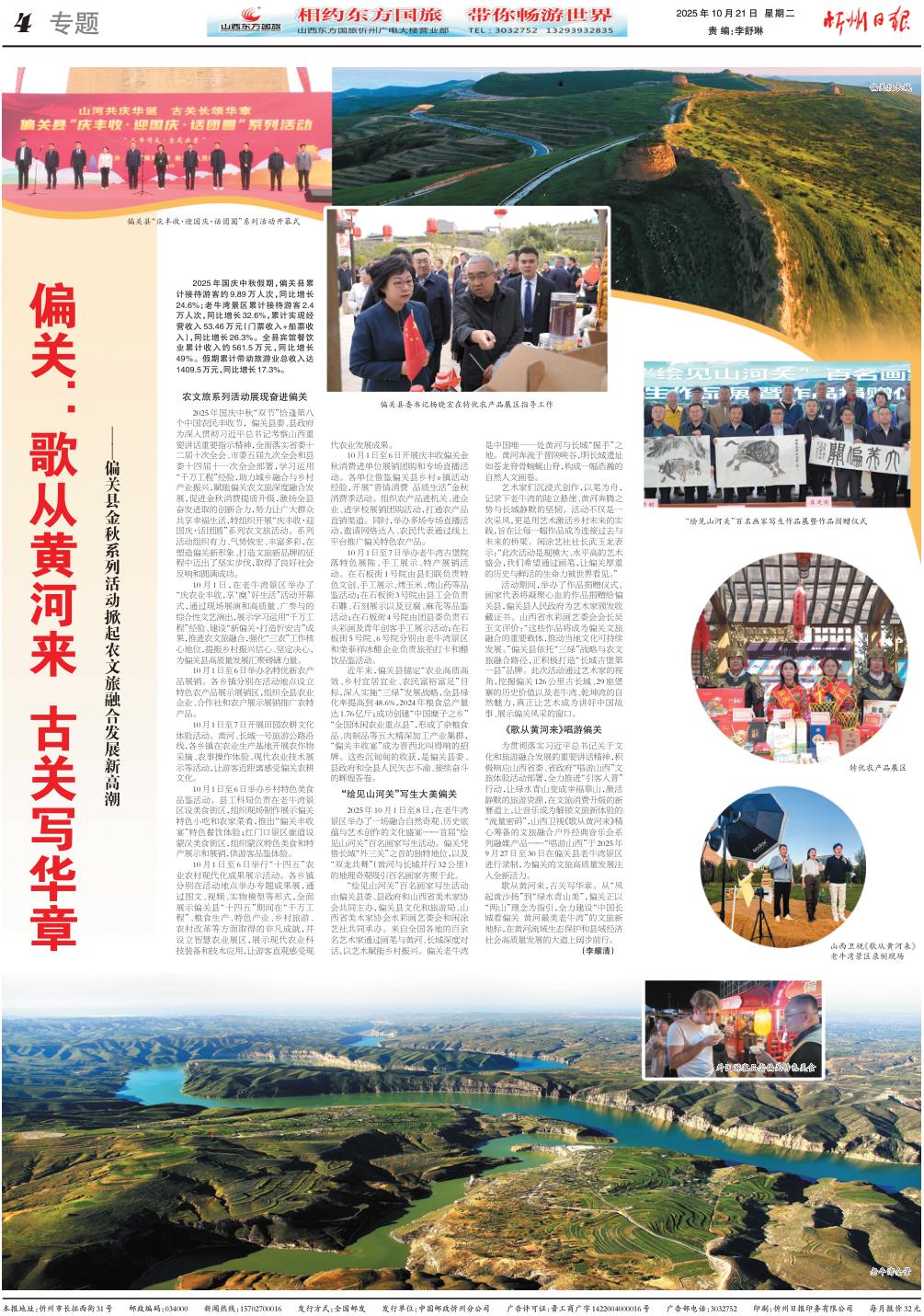 2025年國(guó)慶中秋“雙節(jié)”恰逢第八個(gè)中國(guó)農(nóng)民豐收節(jié),偏關(guān)縣委、縣政府為深入貫徹習(xí)近平總書(shū)記考察山西重要講話重要指示精神,全面落實(shí)省委十二屆十次全會(huì)、市委五屆九次全會(huì)和縣委十四屆十一次全會(huì)部署,學(xué)習(xí)運(yùn)用“千萬(wàn)工程”經(jīng)驗(yàn),助力城鄉(xiāng)融合與鄉(xiāng)村產(chǎn)業(yè)振興,賦能偏關(guān)農(nóng)文旅深度融合發(fā)展,促進(jìn)金秋消費(fèi)提質(zhì)升級(jí),激揚(yáng)全縣奮發(fā)進(jìn)取的創(chuàng)新合力,努力讓廣大群眾共享幸福生活,特組織開(kāi)展“慶豐收·迎國(guó)慶·話團(tuán)圓”系列農(nóng)文旅活動(dòng)。系列活動(dòng)組織有力、氣勢(shì)恢宏、豐富多彩,在塑造偏關(guān)新形象、打造文旅新品牌的征程中邁出了堅(jiān)實(shí)步伐,取得了良好社會(huì)反響和圓滿成功。