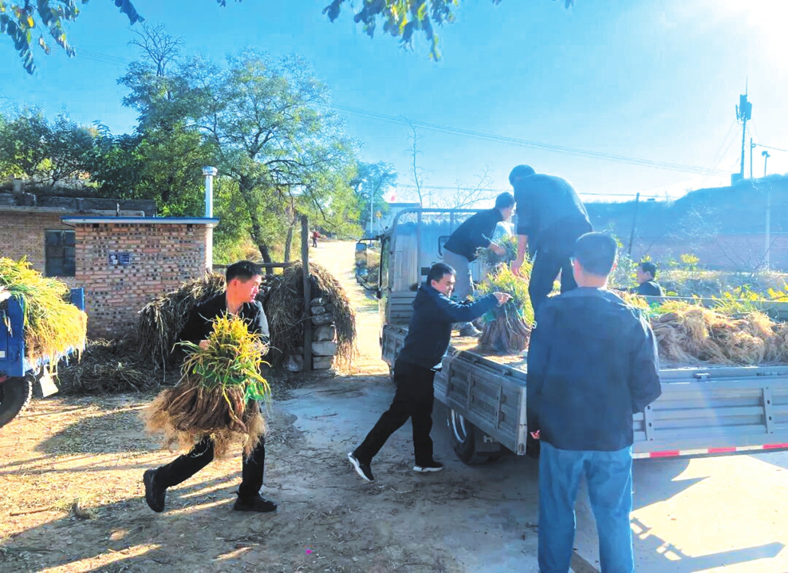 村里的部分孤寡老人,子女不在身邊,又缺乏交通工具,辛苦種植的紅蔥只能依賴商販來村定點收購,價格也不太理想。駐村第一書記阮傳飛說:“不能讓老百姓的汗白流,我們作為駐村的黨校人要行動起來!”于是帶領(lǐng)隊員們化身“快遞員、裝卸工”,開著貨車與村干部一起來到農(nóng)戶門前,直接將紅蔥裝車運往忻州市區(qū)銷售,打通紅蔥從農(nóng)田到餐桌的直銷通道。隊員們分工協(xié)作,稱重、捆綁、搬運、碼放,汗水混著泥土浸濕了衣背卻無人停歇。一上午的工夫,就裝了滿滿一車。顧不得短暫休息,隊員們又馬不停蹄地趕往市區(qū),爭取在天黑前運回市里進(jìn)行售賣。丁家溝75歲的焦大爺激動地說:“多虧了這些駐村干部和年輕同志,要不是他們幫我想辦法,我這些蔥得啥時候才能賣出去?。 ?/p>