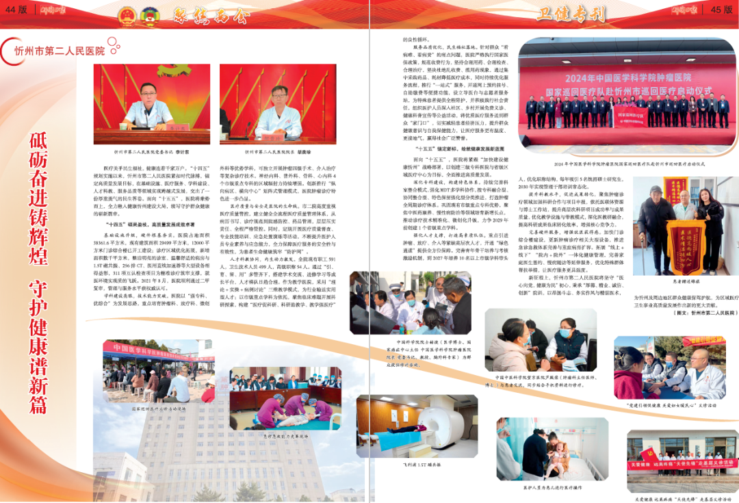 醫(yī)療關(guān)乎民生福祉,健康連著千家萬戶?!笆奈濉币?guī)劃實(shí)施以來,忻州市第二人民醫(yī)院緊扣時(shí)代脈搏,錨定高質(zhì)量發(fā)展目標(biāo),在基礎(chǔ)設(shè)施、醫(yī)療服務(wù)、學(xué)科建設(shè)、人才科教、服務(wù)品質(zhì)等領(lǐng)域?qū)崿F(xiàn)跨越式發(fā)展,交出了一份厚重提氣的民生答卷。面向“十五五”,醫(yī)院將乘勢(shì)而上,全力融入健康忻州建設(shè)大局,續(xù)寫守護(hù)群眾健康的嶄新篇章。