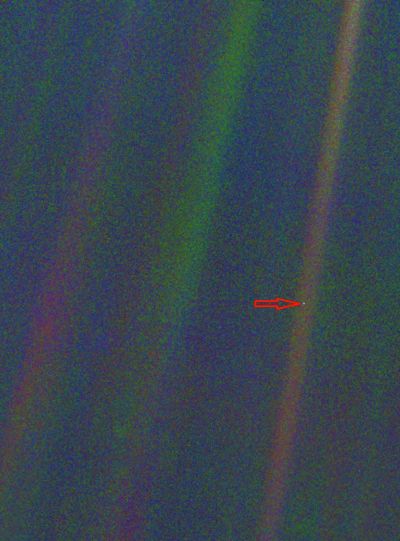 旅行者1號(hào)拍攝的太陽系中的暗淡藍(lán)點(diǎn)兒——地球。