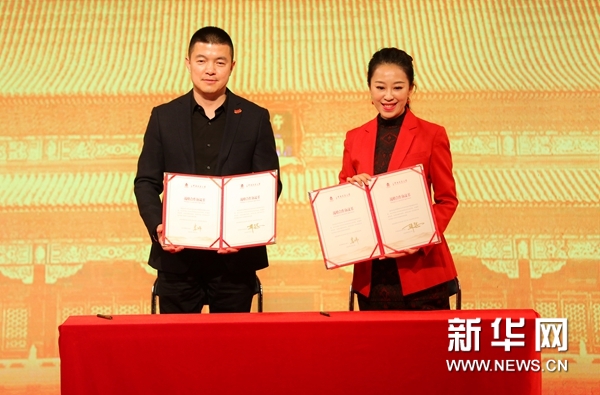 簽約儀式現(xiàn)場,左起故宮博物院副院長婁瑋與中央民族樂團副團長、琵琶演奏家趙聰合影。