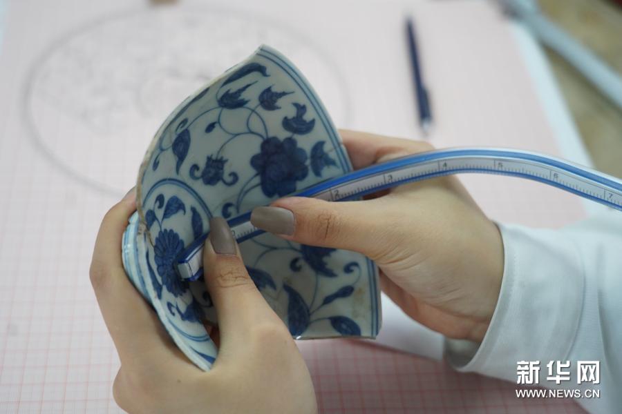 修復(fù)師何奕慧在測(cè)量一件瓷器,將三維瓷器上的圖案還原到二維的紙面上,必須要經(jīng)過仔細(xì)的測(cè)量(12月3日攝)。新華社記者 周密 攝