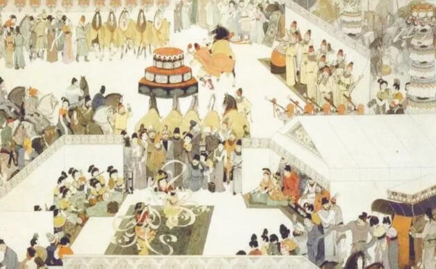 據(jù)張說《請八月五日為千秋節(jié)表》一文中所述,千秋節(jié)節(jié)俗活動主要分廟堂與民間兩個層面。千秋節(jié)前后,朝廷官員“休假三日”,有三天法定假期。千秋節(jié)當天,天色未明之時,“金吾引駕騎,北衙四軍陳仗,列旗幟,被金甲、短后繡袍”,禁衛(wèi)軍排出盛大儀仗。緊接著,群臣為玄宗敬上萬壽酒,進獻金鏡、綬帶(取音同“壽”之意)等禮物,“獻甘露醇酎,上萬歲壽酒,王公戚里,進金鏡綬帶”,玄宗亦也有回賜,“以千秋節(jié)百官獻賀,賜四品以上金鏡、珠囊、縑彩,賜五品以上束帛有差”。