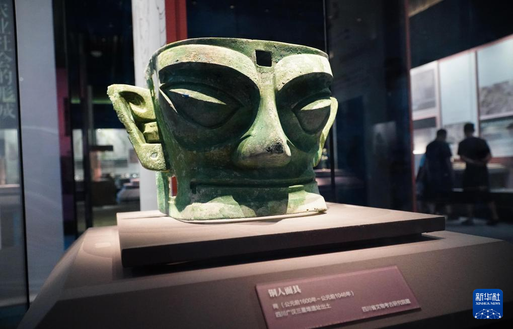 成果展上展出的四川省文物考古研究院藏四川廣漢三星堆遺址出土銅人面具(7月12日攝)。新華社記者 徐速繪 攝