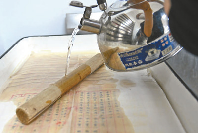首都圖書館,工作人員在給古籍書葉清洗脫酸。