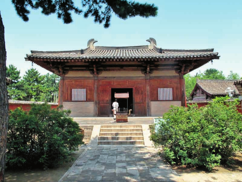 南禪寺大殿面闊、進深各3間,平面近方形,單檐歇山灰色筒板瓦頂。大殿屋頂舉折極為平緩,在我國現(xiàn)存宋、金以前的建筑中,是最為平緩的一座。