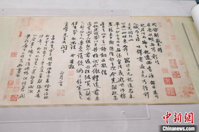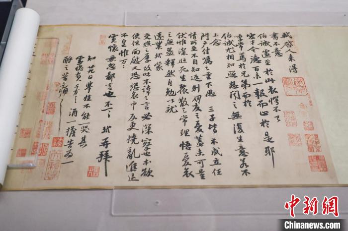 近日,“千古風(fēng)流 不老東坡——蘇軾主題文物展”在海南省博物館舉行。圖為展出的蘇軾真跡《人來(lái)得書(shū)帖》。 中新社記者 駱云飛 攝 在李公羽看來(lái),近年?yáng)|坡文化頻頻出圈,東坡“穿越”千年而愈受年輕人追捧,更在于他是一個(gè)至真至情至性之人。 此展重量級(jí)文物——蘇軾真跡《新歲展慶帖》《人來(lái)得書(shū)帖》合卷,是蘇軾寫(xiě)給友人陳慥的書(shū)信。1081年正月初二,蘇軾貶謫黃州已近一年,他在《新歲展慶帖》中,除“祝頌無(wú)窮”之外,還與同樣喜愛(ài)精美茶具的陳慥商量,欲買(mǎi)一套茶臼子、茶椎子。《人來(lái)得書(shū)帖》則是悲悼陳慥的哥哥去世,“本欲便往面慰,又恐悲哀中反更撓亂,進(jìn)退不皇”。筆墨背后透出的喜怒哀樂(lè)、人生況味,情意真切。 此次展出的湖北省博物館館藏的《醉翁亭記》拓片,是蘇軾中年大字楷書(shū)代表作之一,碑刻原在安徽滁州瑯琊山。1057年,20歲的蘇軾進(jìn)京會(huì)試趕考,主考官正是歐陽(yáng)修。歐陽(yáng)修對(duì)蘇軾頗為賞識(shí),贊他“他日文章必獨(dú)步天下”,后又在《與梅圣俞書(shū)》中寫(xiě)道“老夫當(dāng)避路,放他出一頭地也”。在以行書(shū)見(jiàn)長(zhǎng)的宋代,蘇軾選用楷書(shū)書(shū)寫(xiě)歐陽(yáng)修的長(zhǎng)文,足見(jiàn)其對(duì)恩師的尊重和恭敬。