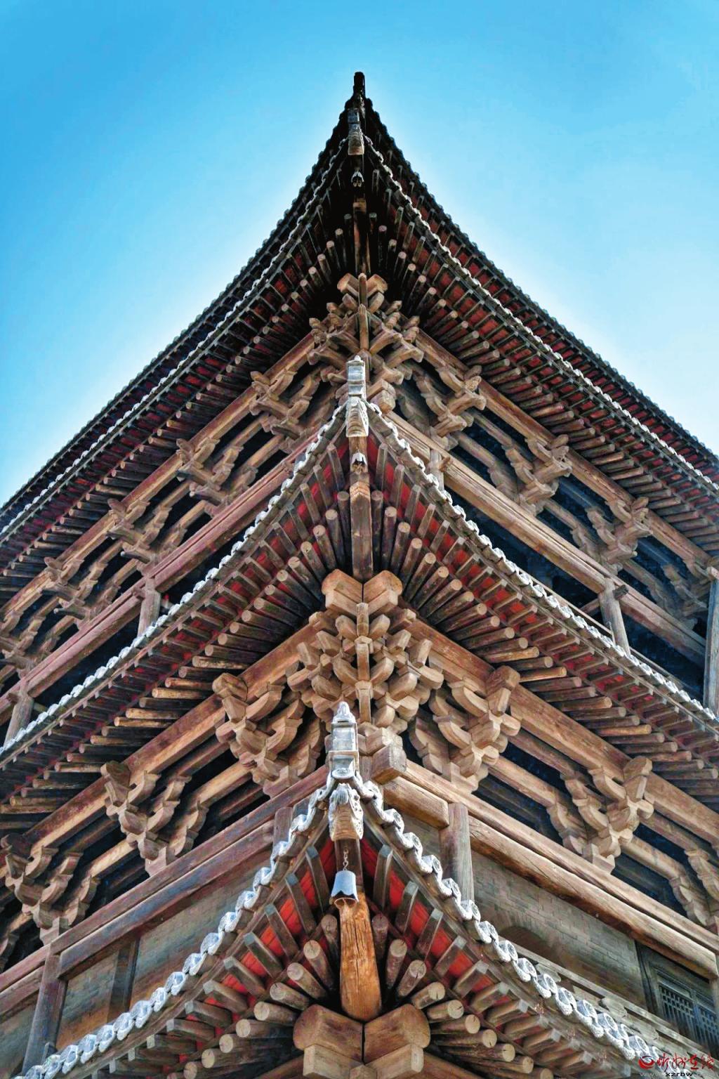 斗拱的分布,除柱頭科和角科外,前后檐明間平身科兩攢,次、梢間和兩山各間皆一攢。二層檐下施五踩雙翹頭,角科加施斜翹頭一縫。三層平座五踩雙翹頭,三層廊下施五踩重昂,三層上檐五踩雙下昂,角科加施角昂和由昂。角科正側(cè)兩面于當(dāng)心翹頭外向增翹頭一列。斗拱制作規(guī)整,結(jié)構(gòu)精巧,構(gòu)造嚴(yán)密適度。