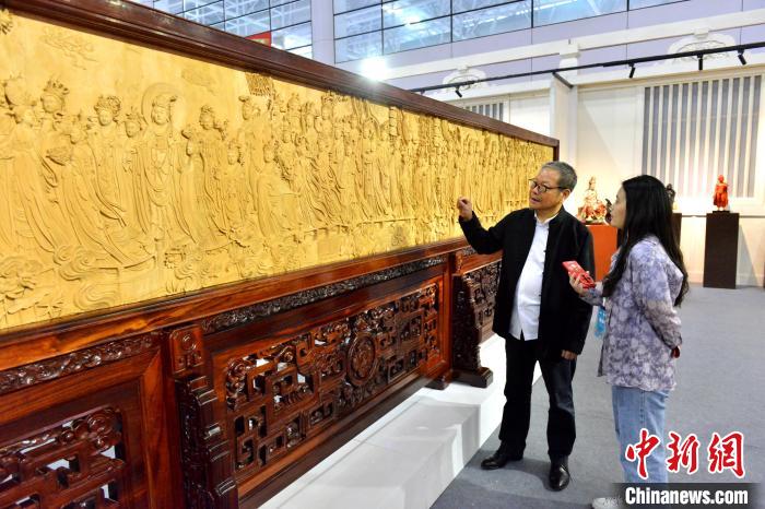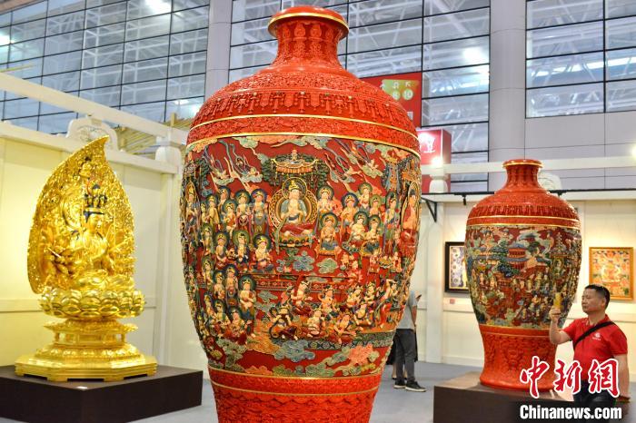 5月9日,第四屆中國(guó)工藝美術(shù)博覽會(huì)在福建福州啟幕,圖為雕漆作品《凈土文化對(duì)瓶》吸引觀(guān)展者目光。 中新網(wǎng)記者 呂明 攝