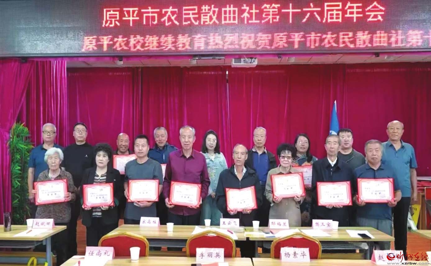 散曲社朗誦部的曲友們在悠揚(yáng)音樂聲中,激情澎湃地朗誦著五谷飄香的農(nóng)民散曲,20多名優(yōu)秀社員受到表彰,展示出原平農(nóng)民散曲的喜慶豐收景象。“詩如潮,農(nóng)民種曲名聲在,情如火,南腔北調(diào)心澎湃。曲如海,同舟共濟(jì)承傳愛,暖如春,一年四季花不敗?;ㄩ_滿地鮮,曲韻熔天籟,好一個震驚曲界田園派?!边@首散曲《正宮·塞鴻秋》道出了散曲社社員們的心聲。