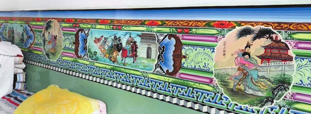 炕圍畫也叫墻圍畫,距今已有1200多年歷史,是原平人特有的“根脈性”藝術(shù)。手工藝人以墻為紙,將民族文化與當(dāng)?shù)厣睢⒕袂擅钊诤?,造型藝術(shù)集壁畫、年畫和建筑彩繪于一體,定格于墻壁之上,代代相傳。“17歲起,我就跟隨父親學(xué)習(xí)炕圍畫技藝,如今有60多年了。”弓進(jìn)壽感慨道,“以前家家戶戶都會在炕邊畫炕圍畫。隨著時代變遷,人們住進(jìn)了樓房,我們就把炕圍畫畫在紙上?!?/p>