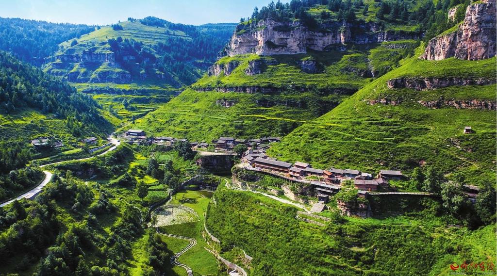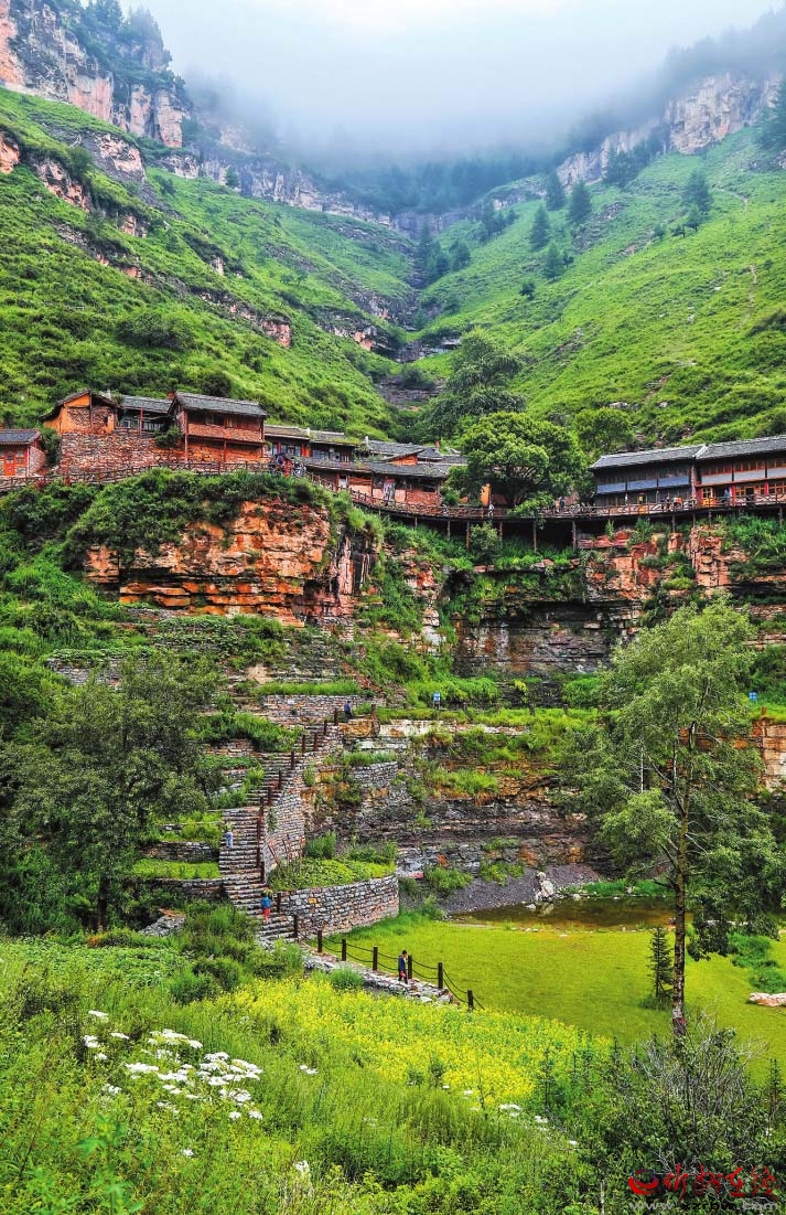基巖構(gòu)造、河谷沖擊、垂直生態(tài)、冷涼氣候……有別于他處的雋永靈秀,寧武之境實乃神來之筆。懸空村位于寧武縣管涔山深處,現(xiàn)為蘆芽山風(fēng)景區(qū)的一個景點,因村莊懸于峭壁之上而稱奇。村里多以石頭和木材建房,村中唯一道路是由圓木搭起的空中棧道,行于其上,猶如走在半空,從崖底仰望,似空中樓閣,故而得名。