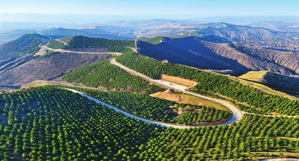 邊塞重地,長年征戰(zhàn),風(fēng)沙肆虐,溝壑縱橫。特殊的地理位置和惡劣的氣候條件,導(dǎo)致偏關(guān)的原始植被幾近絕跡。偏關(guān)人一年中有半年在植樹造林,人工搬苗,人工運水,從山下到山上,再從山上到山下,來回往返,汗水淌過春夏秋冬,足跡踏遍山嶺圪梁。為減少水土流失,他們在山坡上挖交錯排列的魚鱗坑,以貯存“貴如油”的雨水,為油松提供有限的囊盡天地之饋贈的水肥。淺淺的土層,種不下高頭大樹,僅能讓幾十厘米的油松保持直立。偏關(guān)人誓將“荒山”變“綠山”,“換書記不換主意,換縣長不換主張”“一任接著一任干,一級干給一級看”……以堅韌之力重塑山河、治理生態(tài),以愚公之力見縫插綠、逢山播綠,以“饅頭加镢頭、燴菜加會戰(zhàn)”的不屈精神,年年歲歲,綠色接力,將偏關(guān)打造成全省生態(tài)建設(shè)紅旗縣,黃河流域生態(tài)文明建設(shè)先進(jìn)縣,在不毛之地寫下綠色詩行,筑起綠色長城。