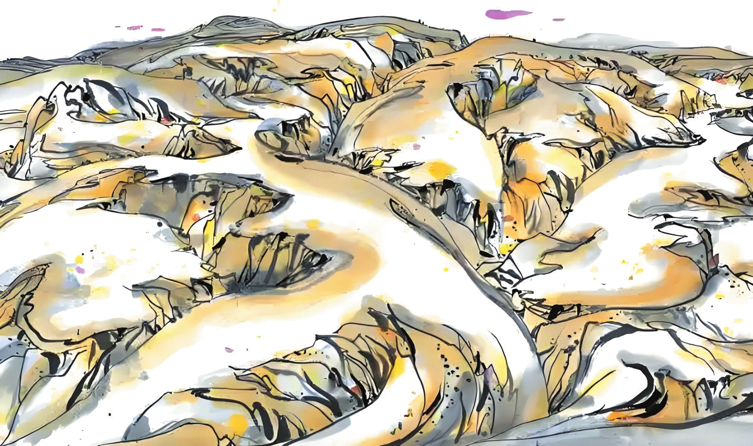 1989年10月的河曲寫生,是吳冠中藝術(shù)生涯的重要轉(zhuǎn)折點(diǎn)。在陪同的學(xué)生王秦生引導(dǎo)下,這位古稀老人尋找“黃土荒漠之典型地區(qū)”,最終駐足晉西北河曲縣。每日晨起,他面對被雨水沖刷、滿山皆溝壑的地貌,靜心思考,猛然產(chǎn)生了驚人的藝術(shù)聯(lián)想——起伏的山形如同眾多老虎,而那些溝壑恰似老虎皮毛上的斑紋。他在《出現(xiàn)老虎》一文中寫道:“我終于發(fā)現(xiàn)黃土高原是展拓了的老虎之群,其間伏臥著無數(shù)猛虎,有的正將躍起,有的還在酣睡。作完數(shù)幅黃土高原,意猶未盡,于是我畫起老虎來?!边@種將地理特征轉(zhuǎn)化為藝術(shù)創(chuàng)作標(biāo)志著吳冠中完成“從風(fēng)景寫生到精神寫意”的蛻變,其價值在于為現(xiàn)代中國畫開辟了根植本土、融貫中西的新路徑。一個月河曲翠峰山寫生之旅誕生的《老虎高原》,更以極富樂感的線條勾勒出這片土地精神的圖騰。