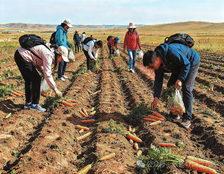 “撿秋”游演繹著“鄉(xiāng)土中國(guó)”的現(xiàn)代篇章。費(fèi)孝通在《鄉(xiāng)土中國(guó)》開篇即言“從基層上看去,中國(guó)社會(huì)是鄉(xiāng)土性的”。這種“鄉(xiāng)土性”的核心是人與土地的深度綁定。農(nóng)民靠土地生存,土地是文化認(rèn)同的根基。“撿秋”這種農(nóng)耕活動(dòng),如今以更加鮮活方式延續(xù)下來。對(duì)農(nóng)民而言,土地不僅是謀生手段,更是安身立命的“精神原鄉(xiāng)”。而城市游客的參與則賦予了“撿秋”新的意義。在城市里待久了,就想蹲在田里感受泥土的溫度,游客“撿秋”體驗(yàn)的是“春種秋收”踏實(shí)感。這種體驗(yàn)式參與是現(xiàn)代人對(duì)鄉(xiāng)土文明的“情感反哺”。游客們彎腰的身影既是對(duì)土地的致敬,也是對(duì)“根”的追尋。他們未必真懂農(nóng)事,但通過參與“撿秋”完成了對(duì)鄉(xiāng)土文化的認(rèn)同,被撿起的“果實(shí)”從“生存作物”演變?yōu)椤拔幕浇椤?。?dāng)前,內(nèi)蒙古各地推出的挖土豆、烤土豆等旅游項(xiàng)目是對(duì)鄉(xiāng)土資源的文化再“編碼”,當(dāng)土豆從田間走向游客的后備箱,“鄉(xiāng)土中國(guó)”便獲得了更加豐富的表達(dá)。