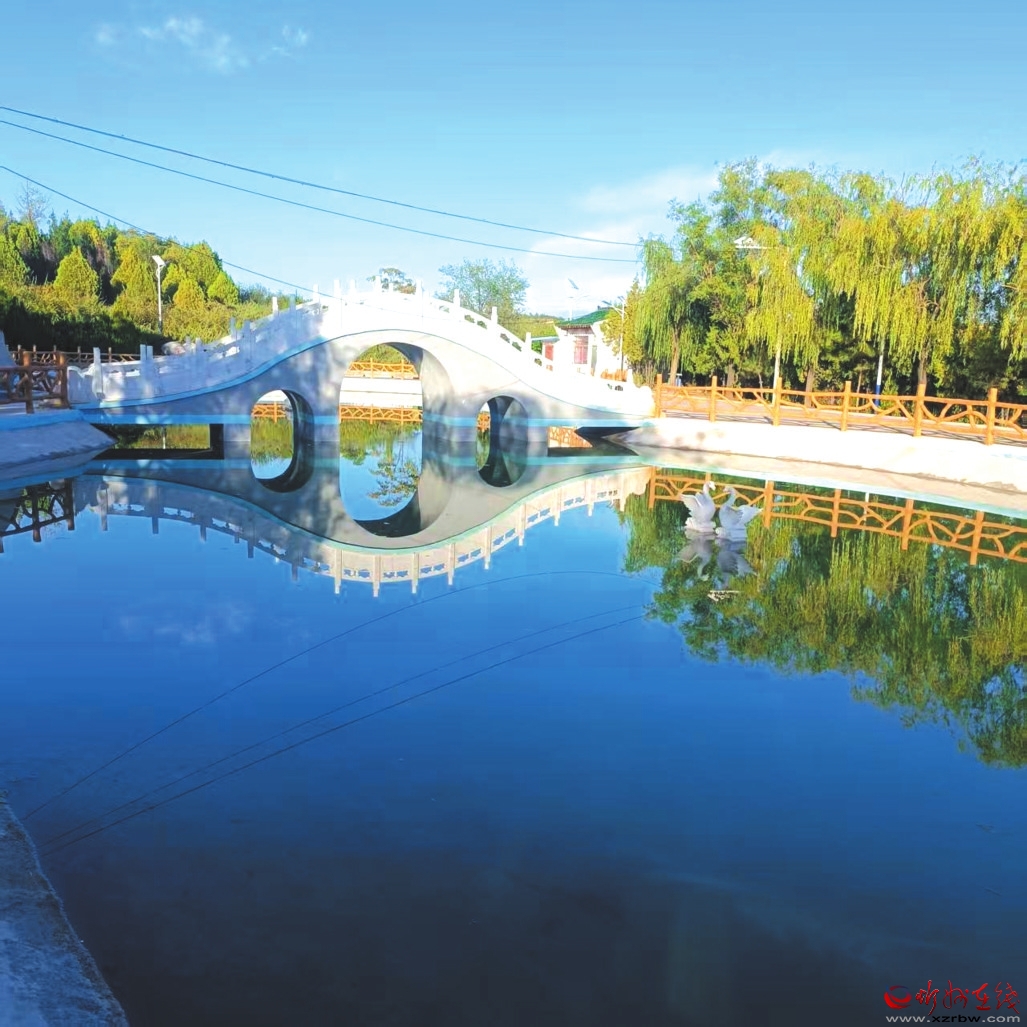 沿路而下,過橋爬坡,便到了天鵝湖。誰(shuí)能想到,這碧水涵虛的景致,原是當(dāng)年造林蓄水的大水坑?工程完工后順勢(shì)修整,竟成飛龍山又一勝景。天鵝湖呈葫蘆狀,漢白玉拱橋橫跨腰間如玉帶,橋東石雕飛龍昂首欲飛,橋西石雕雙鵝戲水憨萌。湖水清澈見底,倒映藍(lán)天白云綠樹,風(fēng)過時(shí)漣漪擴(kuò)散,美得讓人心醉,連時(shí)間都慢了下來(lái)。