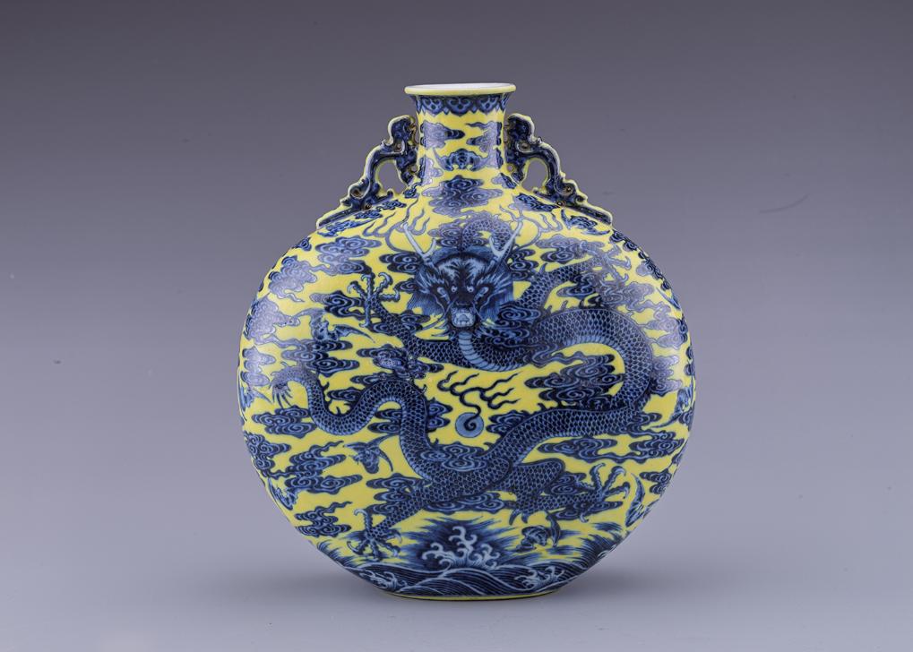 展出的清乾隆黃地青花云龍紋寶月瓶。