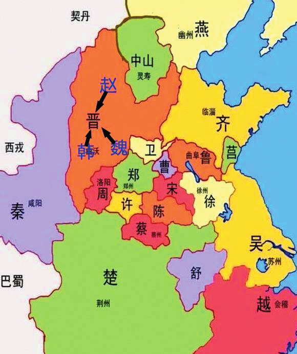 晉文公執(zhí)政繼承其父三軍六卿制,韓、趙、魏、范、智、中行六卿各有自己的領(lǐng)地,勢(shì)力日漸擴(kuò)張,他們一方面維護(hù)晉國(guó)霸業(yè),另一方面蠶食晉國(guó)君權(quán)和國(guó)土。到晉定公時(shí)期,晉國(guó)權(quán)勢(shì)趨向衰弱,六卿之間也相互蠶食領(lǐng)地。晉出公時(shí)期,智氏組織韓、趙、魏討伐范氏和中行氏,迫使二氏出逃,后韓、趙、魏、智四家瓜分了范氏和中行氏所有封地。四氏中,智氏領(lǐng)土最多,勢(shì)力最強(qiáng),故向韓、趙、魏索要所得封地,韓、魏懼而滿足智氏要求,趙斷然拒之,被迫出逃,智氏組織韓、魏擊之未成。事后,韓、魏共識(shí)前車之鑒,唇亡齒寒,于是韓、趙、魏三卿聯(lián)合擊智,盡滅智氏全族。