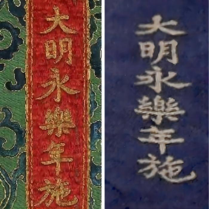 ▲“大明永樂年施”題款對比圖,左側(cè)綠底為永樂御制紅閻摩敵刺繡唐卡,右側(cè)藍底為明永樂勝樂金剛織錦唐卡。