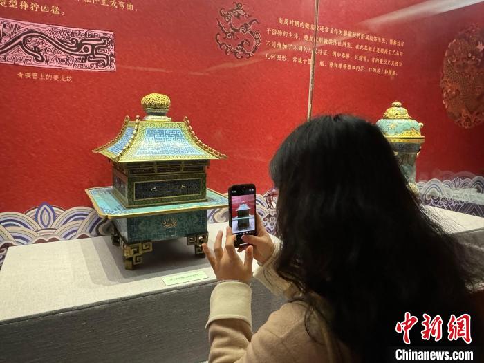 本次展覽中展出的“清掐絲琺瑯夔龍紋亭式熏爐”,此爐為清宮原藏琺瑯器中體量較大的一件。記者 韓宏攝