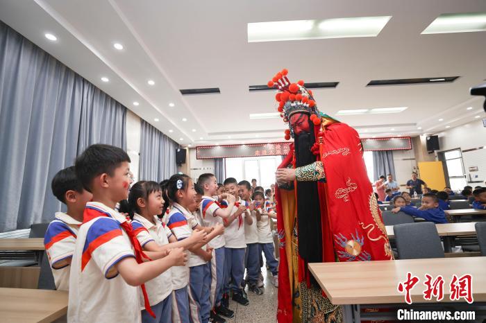 2023年6月26日,山西太原,小學(xué)生們與戲曲人物關(guān)公互動。當(dāng)日,山西省武凌云晉劇名家工作室的藝術(shù)家們走進太原新建路小學(xué)校,將傳統(tǒng)戲曲引進課堂,讓學(xué)生們感受戲曲的魅力。 中新社記者 張云 攝