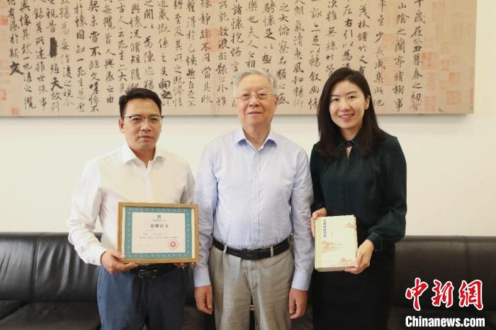 李紅強總編輯(左)代表人民文學出版社向國家圖書館捐贈《莫礪鋒演講錄》一種三冊,霍瑞娟副館長(右)代表國家圖書館接受捐贈并頒發(fā)證書。儀式后雙方與莫礪鋒教授(中)合影。 主辦方供圖