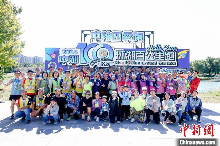 參加百公里環(huán)湖跑活動的跑者們合影。 龍?zhí)吨泻珗@供圖