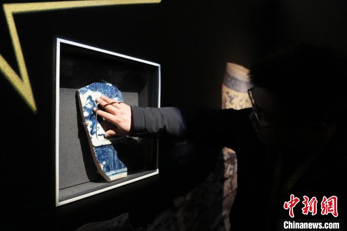 “御瓷凝瑞——景德鎮(zhèn)御窯遺址出土吉祥動(dòng)物紋瓷特展”現(xiàn)場(chǎng),觀眾在觸摸距今約580年的景德鎮(zhèn)瓷器殘片。 史春陽(yáng) 攝